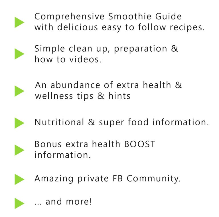 As part of this plan you will be provided with 10 delicious simple green smoothies packed full of concentrated nutrients, clean-up, prep and how-to videos along with an abundance of extra nutritional & super-food information with the added bonus of an incredible private Facebook group focused on answering your questions and providing you with added support and motivation.